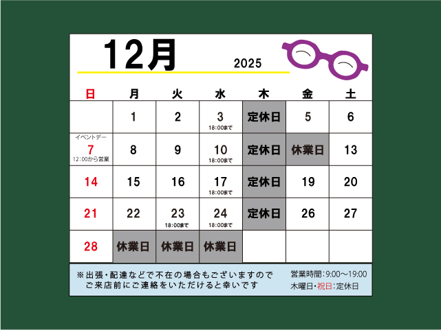 12/4・11・12・18・25・29・30・31は休業日とさせていただきます